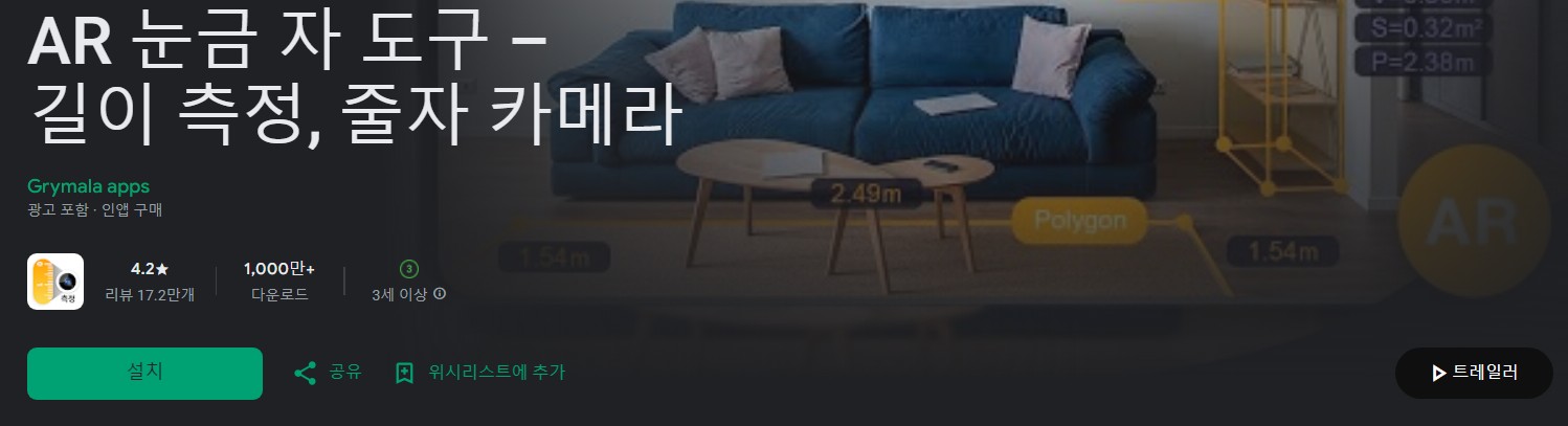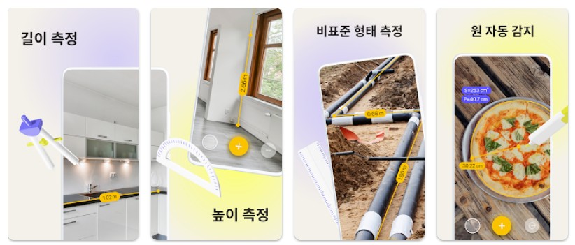 이 중에서도 아래 어플은 최신 기술을 활용한 AR(증강 현실) 줄자 앱들은 스마트폰 카메라를 이용해 실시간으로 길이와 거리를 측정할 수 있어 매우 편리합니다. 카메라를 통해 원하는 대상을 찍기만 하면 길이뿐만 아니라 폭, 면적까지도 직관적으로 측정할 수 있기 때문에 효율성이 뛰어납니다.