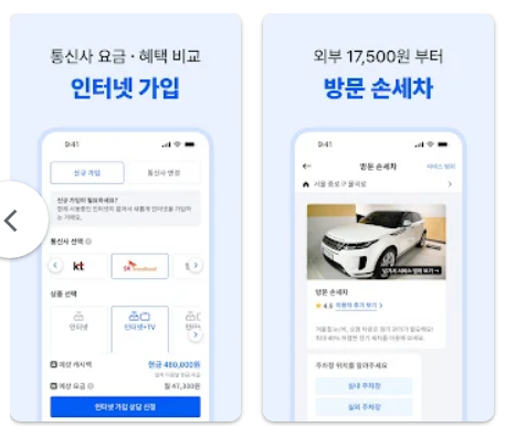 - 메인 화면에서 제공되는 여러 서비스 목록을 확인합니다. 예를 들어, 가사도우미, 이사, 청소, 인터넷 가입, 세차, 가전 렌탈 등 다양한 카테고리가 표시됩니다.