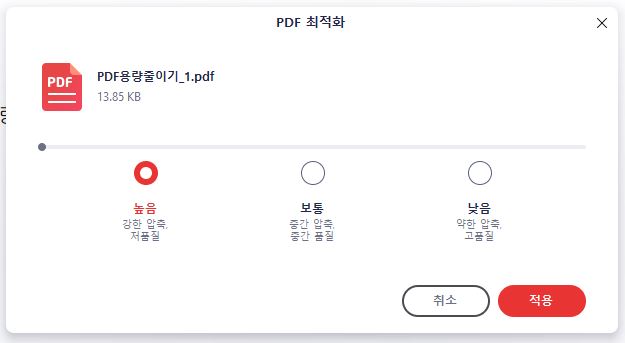 최적화 단계는 총 3단계입니다. 높음(강한 압축 저품질), 보통(중간 압축, 중간 품질), 낮음(약한 압축, 고품질) 중 원하는 단계를 선택하여 적용을 클릭합니다. 적용 후 저장하면 완료됩니다.