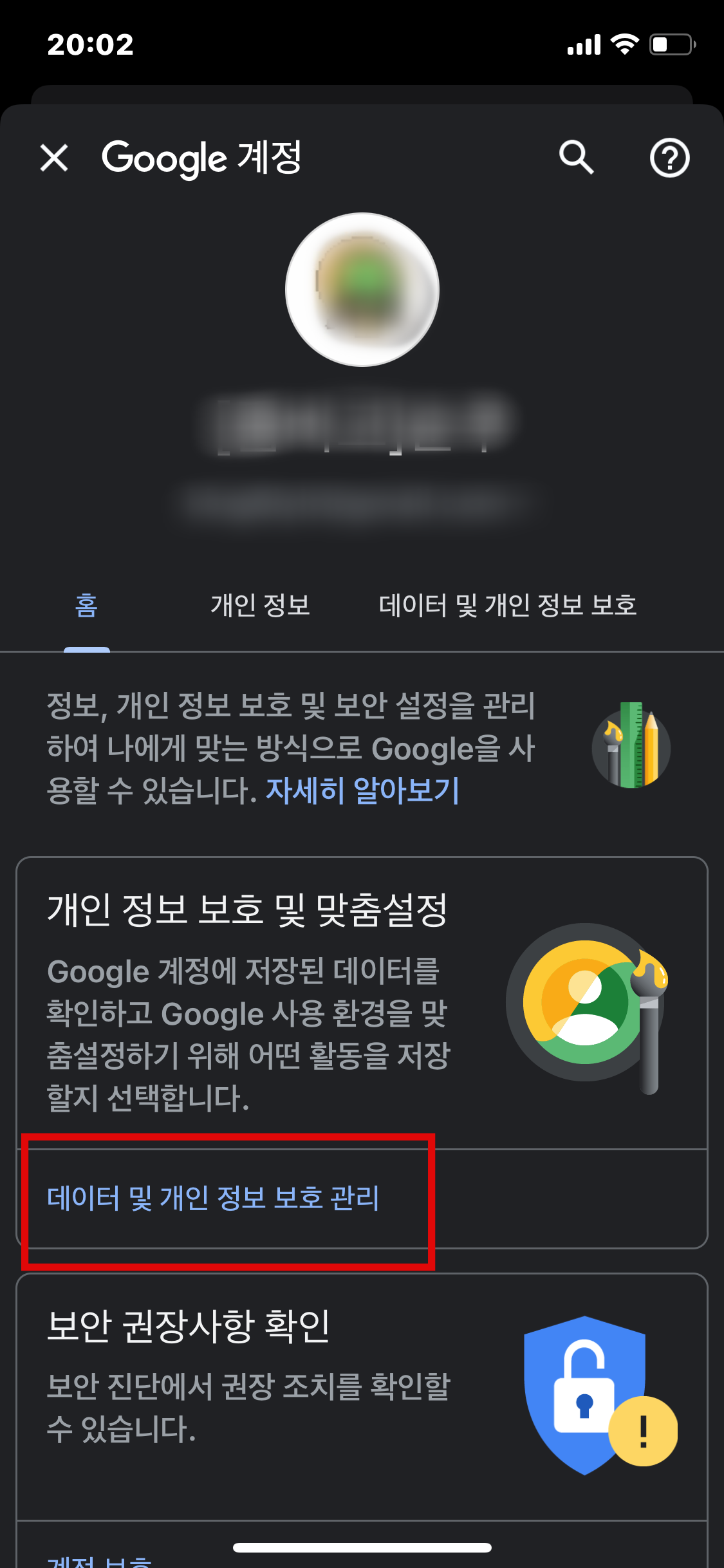 Google 계정에 저장된 데이터를 확인하거나 사용 환경에 대한 맞춤 설정을 하기 위해 [데이터 및 개인 정보 보호 관리]를 선택합니다.