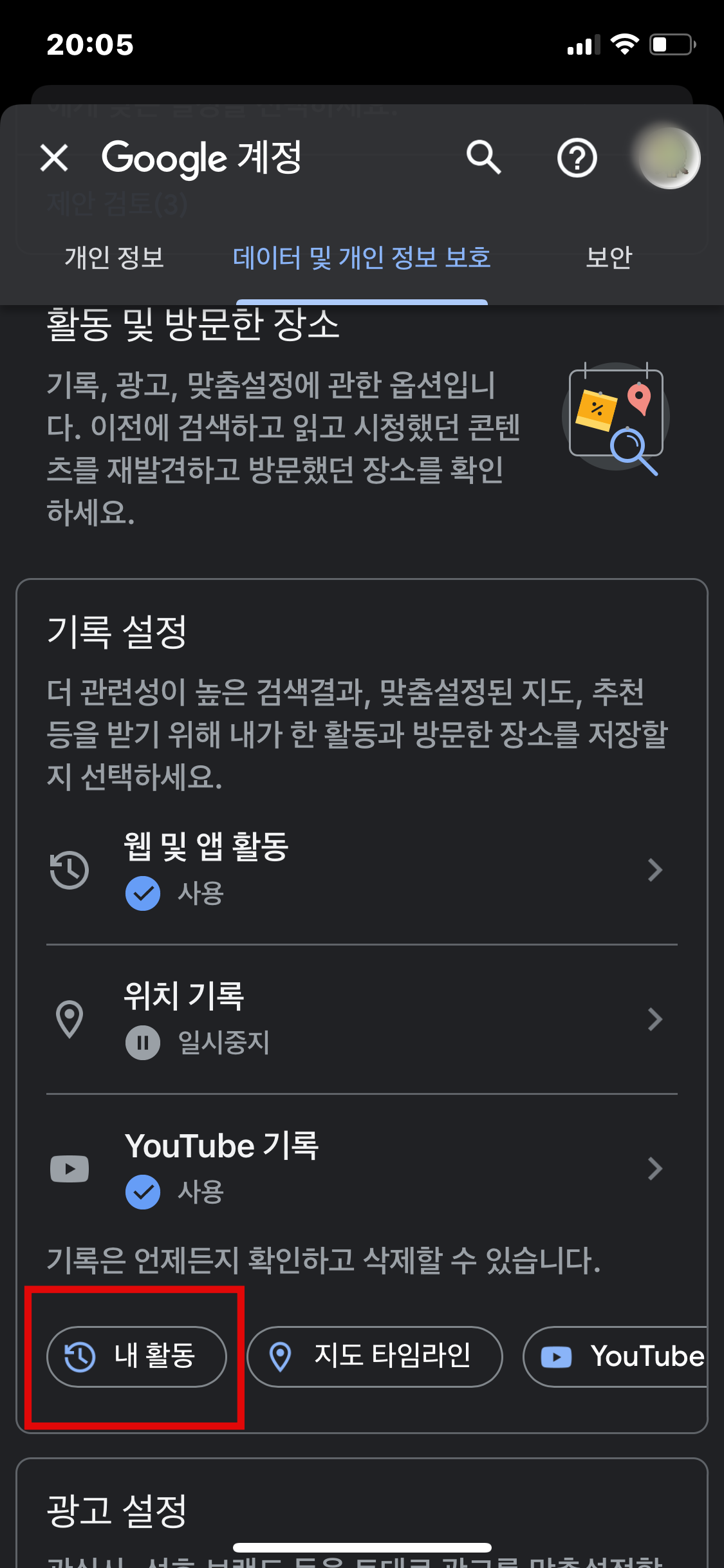 다시 [Google 계정 관리] - [데이터 및 개인 정보 보호 관리]에 들어갑니다.
