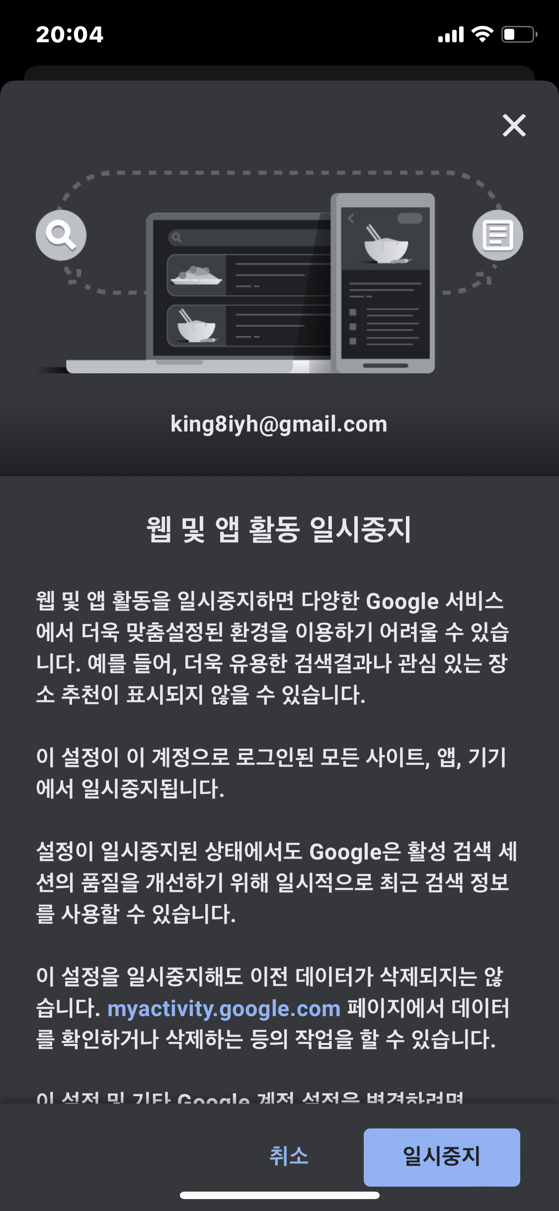 그리고 [일시중지]를 선택 클릭하면 구글 검색기록 끄기가 완료됩니다. 이상태에서도 구글은 활성 검색 세션의 품질을 개선하기 위해 일시적으로 최근 기록을 사용할 수 있습니다.