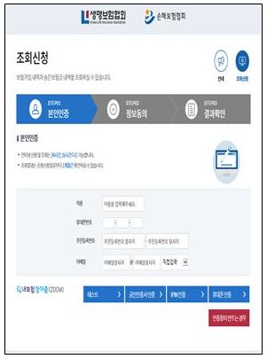 1. 내보험 찾아줌(http://cont.insure.or.kr) 접속 → 정보 입력 후 조회 신청