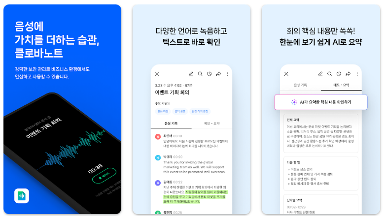 클로바노트는 비즈니스 회의를 기록하고 요약하는 데 유용한 도구로, 모바일과 PC에서 언제든지 녹음할 수 있는 기능을 제공합니다. 이를 통해 사용자는 상황에 맞게 손쉽게 노트를 생성하고 관리할 수 있습니다.