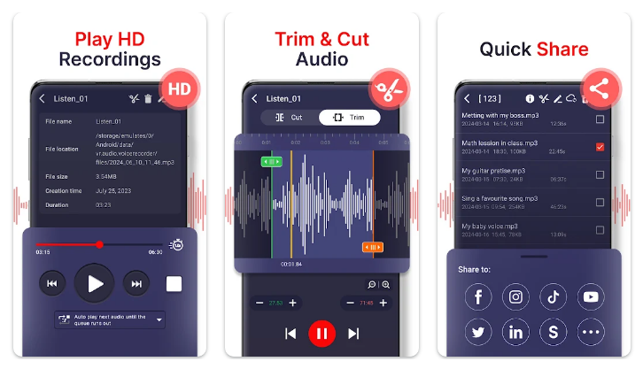 - 고음질 녹음: 깨끗하고 정확한 음질로 제한 없이 다양한 형식(AAC, M4A, AMR, MP3) 녹음 가능