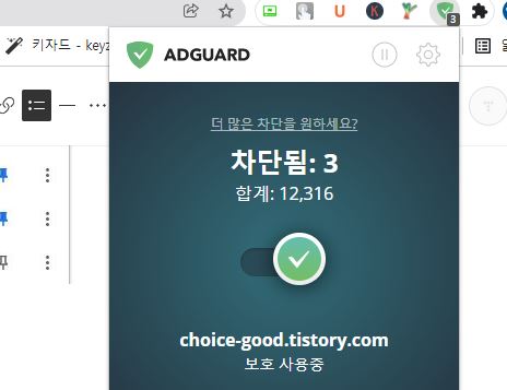 - 크롬 브라우저 오른쪽 상단에 고정된 ADGUARD 아이콘을 클릭하면 아래 그림과 같이 실행장이 나타납니다. 클릭하여 활성화하면 유튜브나 웹서핑 시 광고를 제거해 줍니다.